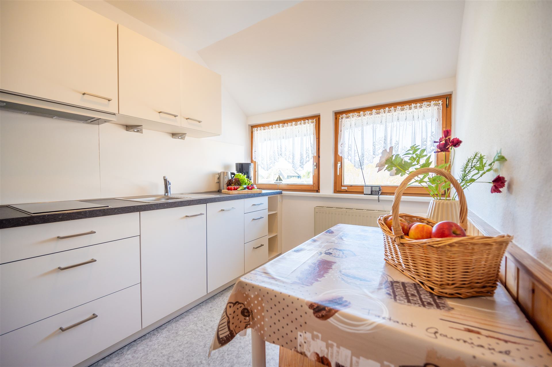 • Küche mit Geschirrspüler, Microwelle, Ceranfeld, Essbereich, Kochutensilien